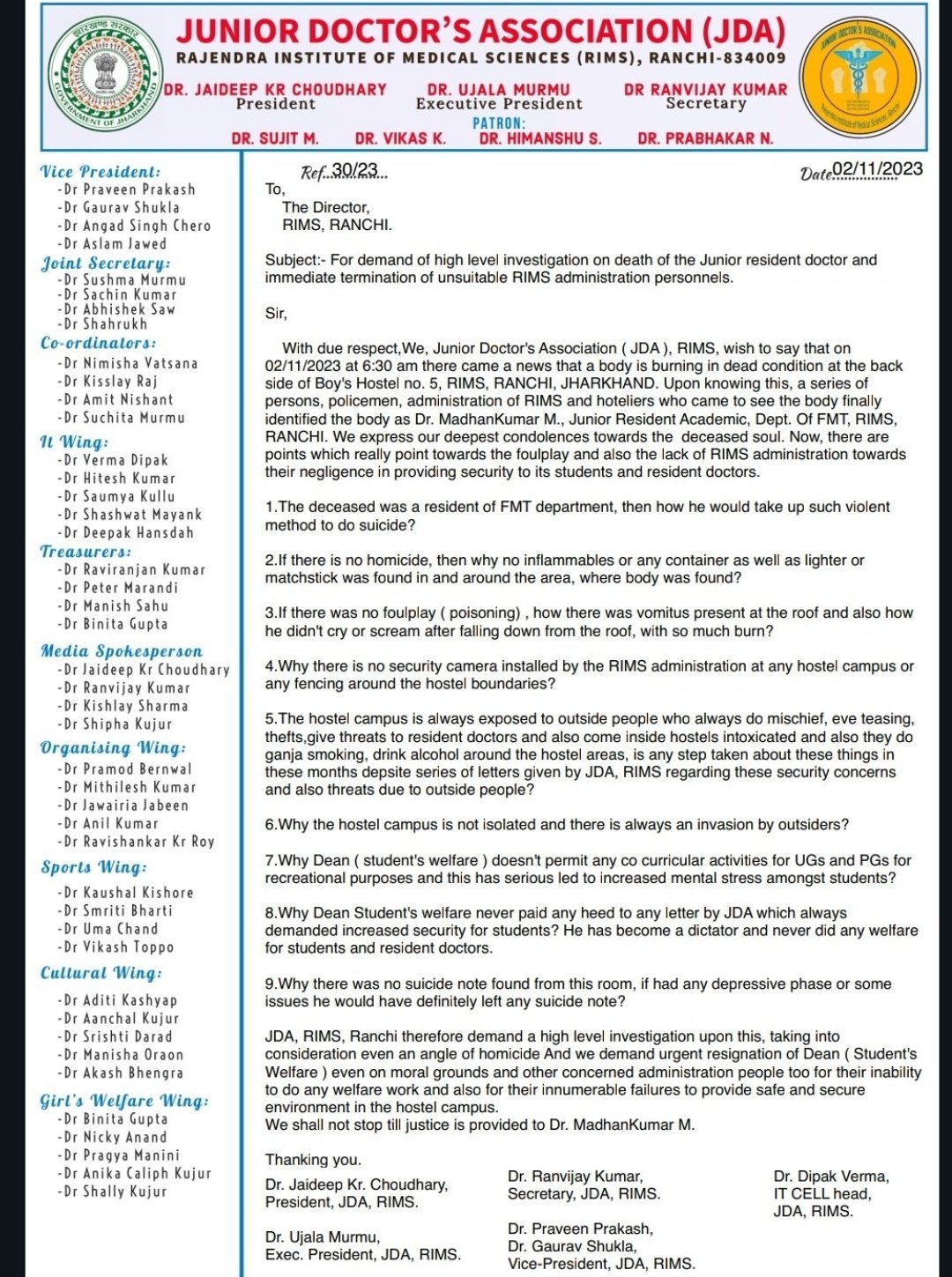 Amid the tense situation and lack of clarity over the cause of the death of Dr. Madan Kumar M, the Junior Doctor's Association (JDA) of RIMS wrote a letter to the institute's director, demanding a high-level investigation and the dismissal of incompetent staff from the college. The letter, a copy of which was uploaded on X by Kundan Pal, raises not only deep suspicions about Madan's death but also levels serious allegations against the RIMS administration.