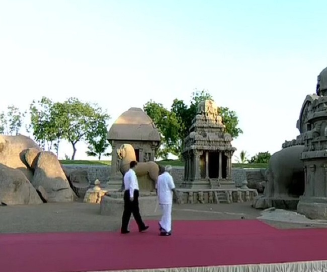 17:35 pm: Prime Minister Narendra Modi with Chinese President Xi Jinping at Panch Rathas in Mahabalipuram.