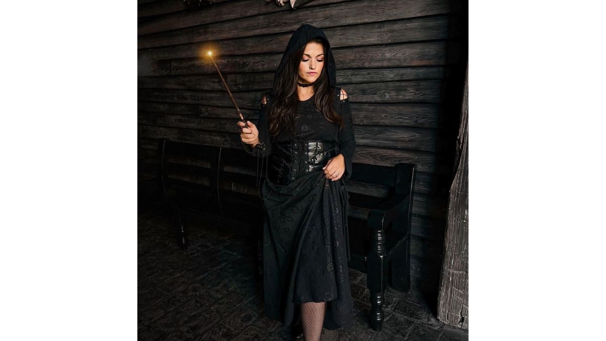 You can become your favourite Harry Potter character. For styling villainous Bellatrix, you just need a long black dress, a waist leather belt, a wand, a classic black hat and a black choker necklace to complete your overall Halloween look.