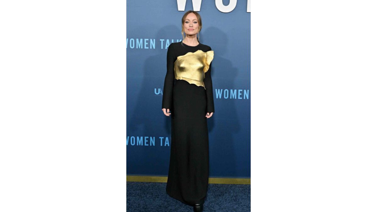 Olivia Wilde wore Gabriela Hearst's 'Cybele' dress from the Spring/Summer 2023 collection to the Women Talking premiere in Los Angeles. She added drama with an asymmetric metallic leather breastplate in sculpted gold Nappa. Wilde accessorized the look with gold earrings and black platform heels.