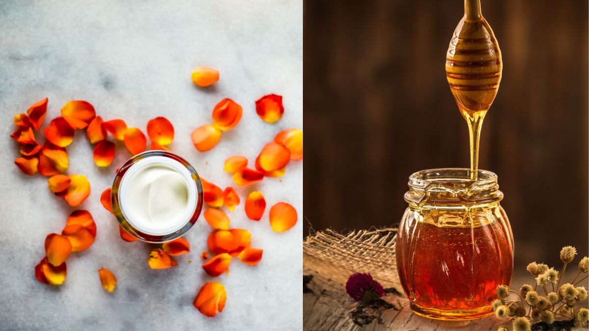 All you need to make the honey and rose oil face mask is one tablespoon of honey, one tablespoon of aloe vera gel, and four drops of rose oil.