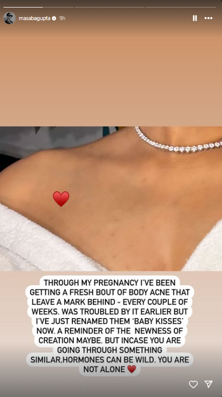 Taking to her Instagram stories, Masaba Gupta wrote, “Through my pregnancy, I’ve been getting a fresh bout of acne that leaves a mark behind every couple of weeks. I was troubled by it earlier, but I’ve just renamed them ‘baby kisses’ now. A reminder of the newness of creation maybe. But in case you are going through something similar, hormones can be wild. You are not alone.”