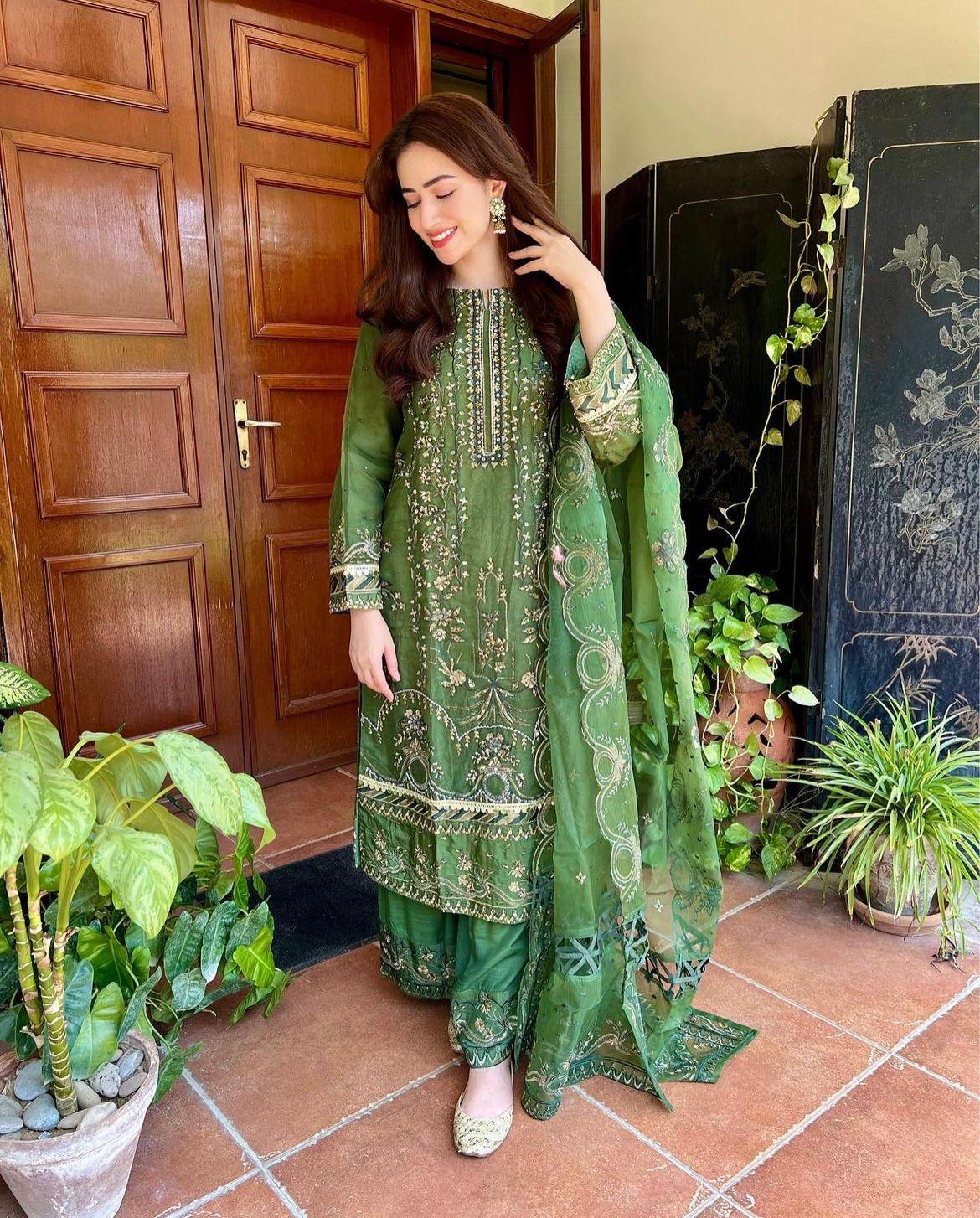Khaani fame actress, Sana Javed, appears to be a goddess while sporting the 'IT' look for every event. Sana is the type of person who isn't afraid to try new looks. Sana wore a full-length green suit, and she topped off her look with the gorgeous earrings. Sana picked a modest and elegant makeup look, with glossy lips and flushed cheeks.