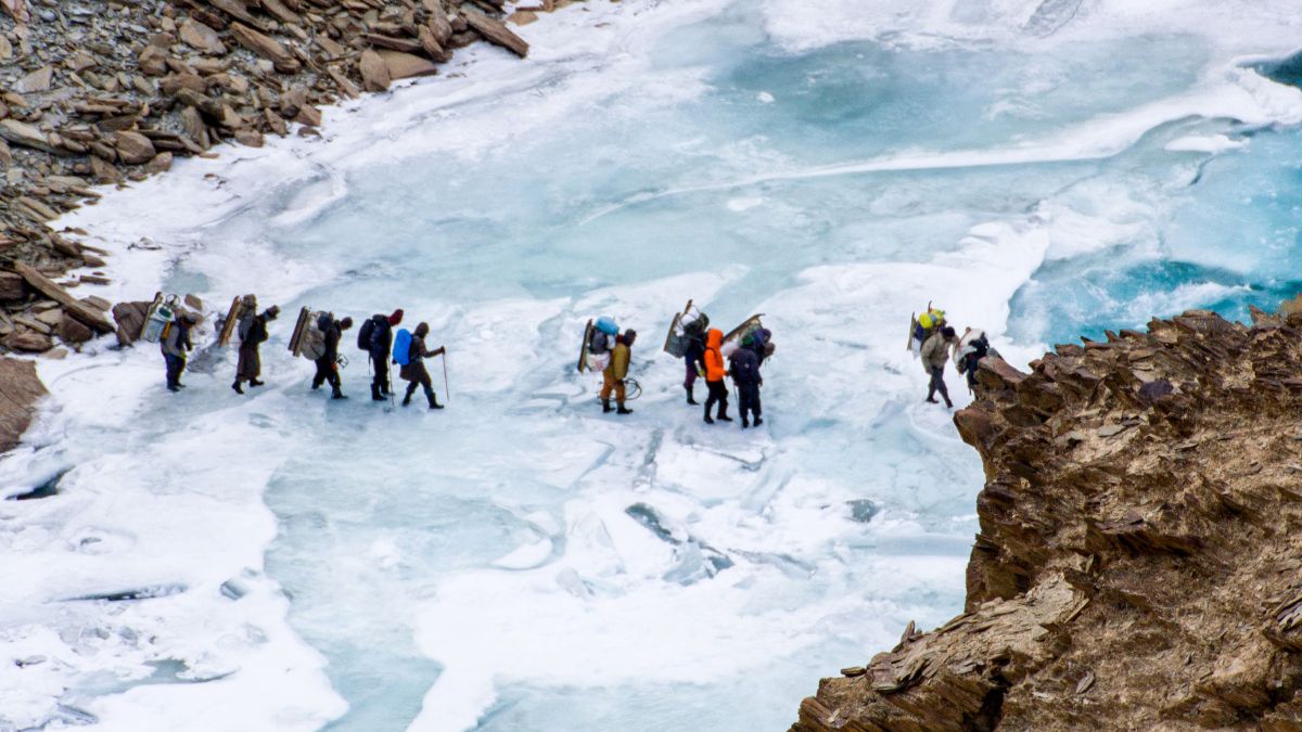 The Chadar Trek in Ladakh includes crossing the ice-covered Zanskar River, which is a unique and challenging experience. Only in the winter, when the river's surface is solidly frozen, is this extraordinary trek feasible. Trekkers make their way across the snowy countryside, traveling through deep canyons and otherworldly ice formations as well as beautiful frozen scenery.