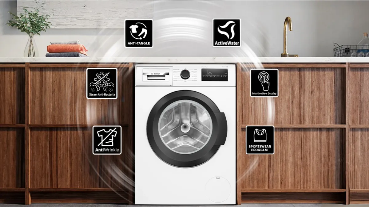This Bosch model also focuses on hygiene. The steam anti bacteria wash helps remove germs, good for baby clothes and uniforms. It also has an inbuilt heater so you can run hot wash cycles. That helps remove oil stains and tough dirt. The anti wrinkle function is useful too because clothes come out with less creases. Some users on Amazon even said shirts hardly need ironing after washing here.