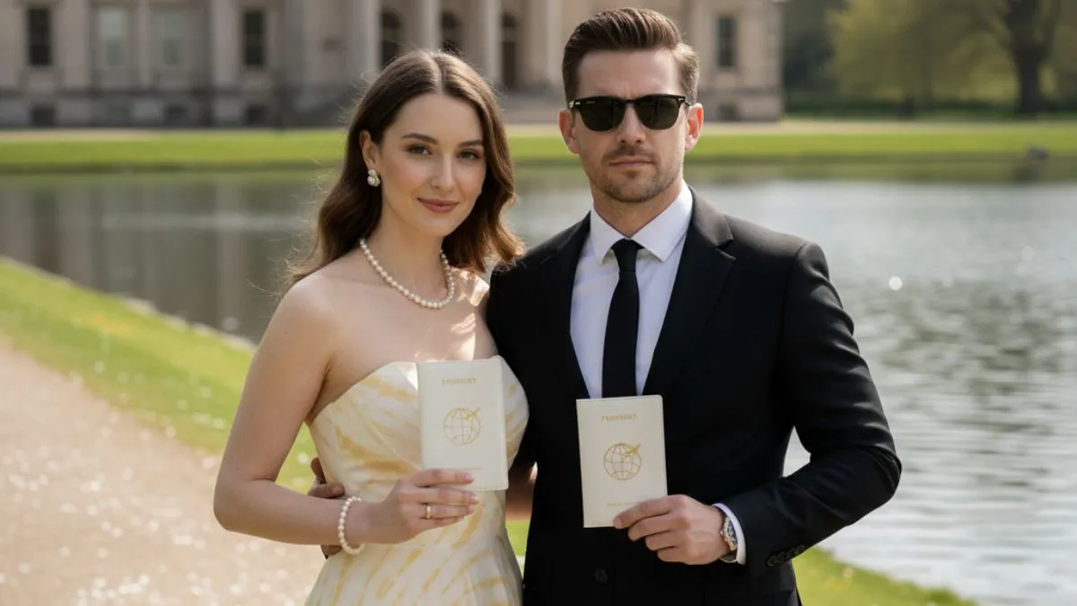 Create a stylish couple standing outdoors in front of a historic building and a calm lake. The woman, in a strapless yellow-and-white tie-dye dress with pearl accessories, smiles softly beside a confident man in a black suit and sunglasses. White petals scatter on the grassy path as reflections shimmer in the water. Add matching passport covers to show the couple's goals and keep the face and body features 100% real. (Note: You can change the theme as per your requirements.)