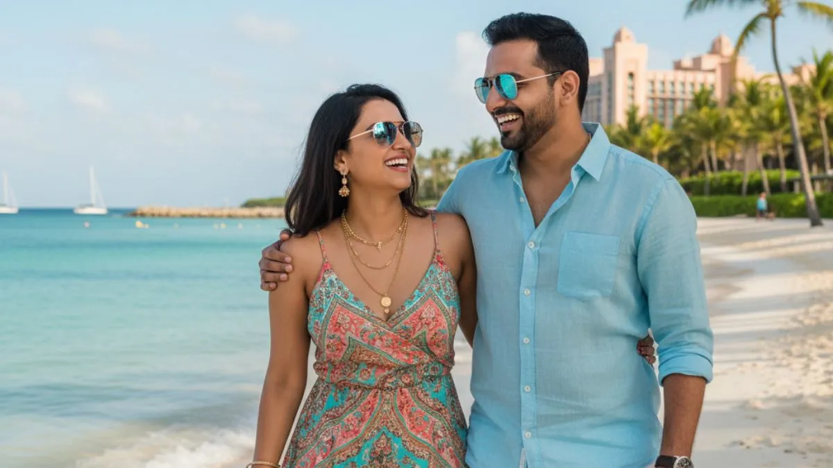 This couple in the picture is on vacation, looking stylish and happy. They are both wearing coordinated, fashionable sunglasses that complement each other's outfits and the sunny vacation setting. The image should capture a sense of fun and romance, with a beautiful backdrop that suggests a relaxing getaway.