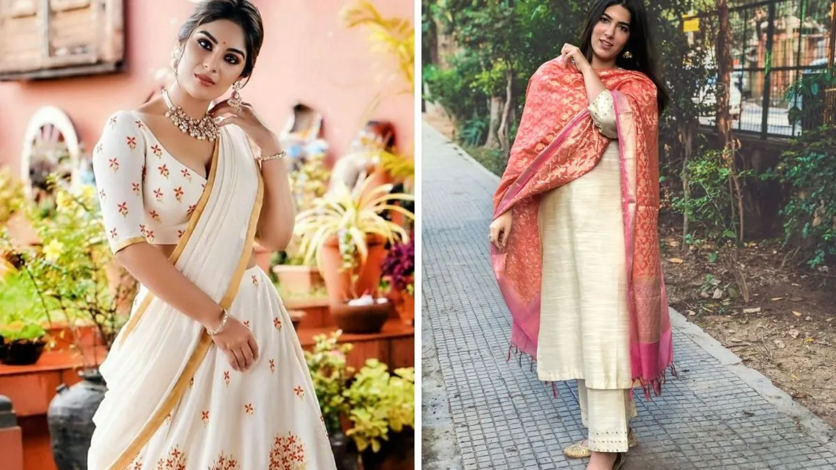 - You can go with a white kurta and gold dupatta with heavy jhumkha for a festive look.