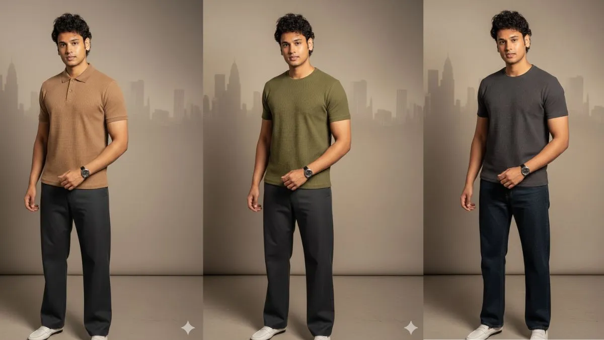 A photorealistic, trending, and high-fashion image of this young man in the picture embodying the 'Gemini AI Boy Style' with a modern, clean-cut aesthetic. He is wearing a premium, textured crew-neck T-shirt in a sophisticated color like deep charcoal grey or olive green, ensuring the fabric shows visible texture (e.g., slub or waffle knit). This is paired with a smart outfit consisting of dark, wide legged jeans or trousers, and clean, minimalist white sneakers or leather loafers, with a subtle, high-quality watch visible on his wrist. The image should feature cinematic lighting, composed as a medium close-up or upper body shot, set against a minimalist urban environment like a smooth, neutral-colored wall or a soft-focus cityscape. The final result must be ultra-detailed, hyper-realistic, in 4K resolution, with sharp focus, vibrant colors, soft shadows, and magazine cover quality.