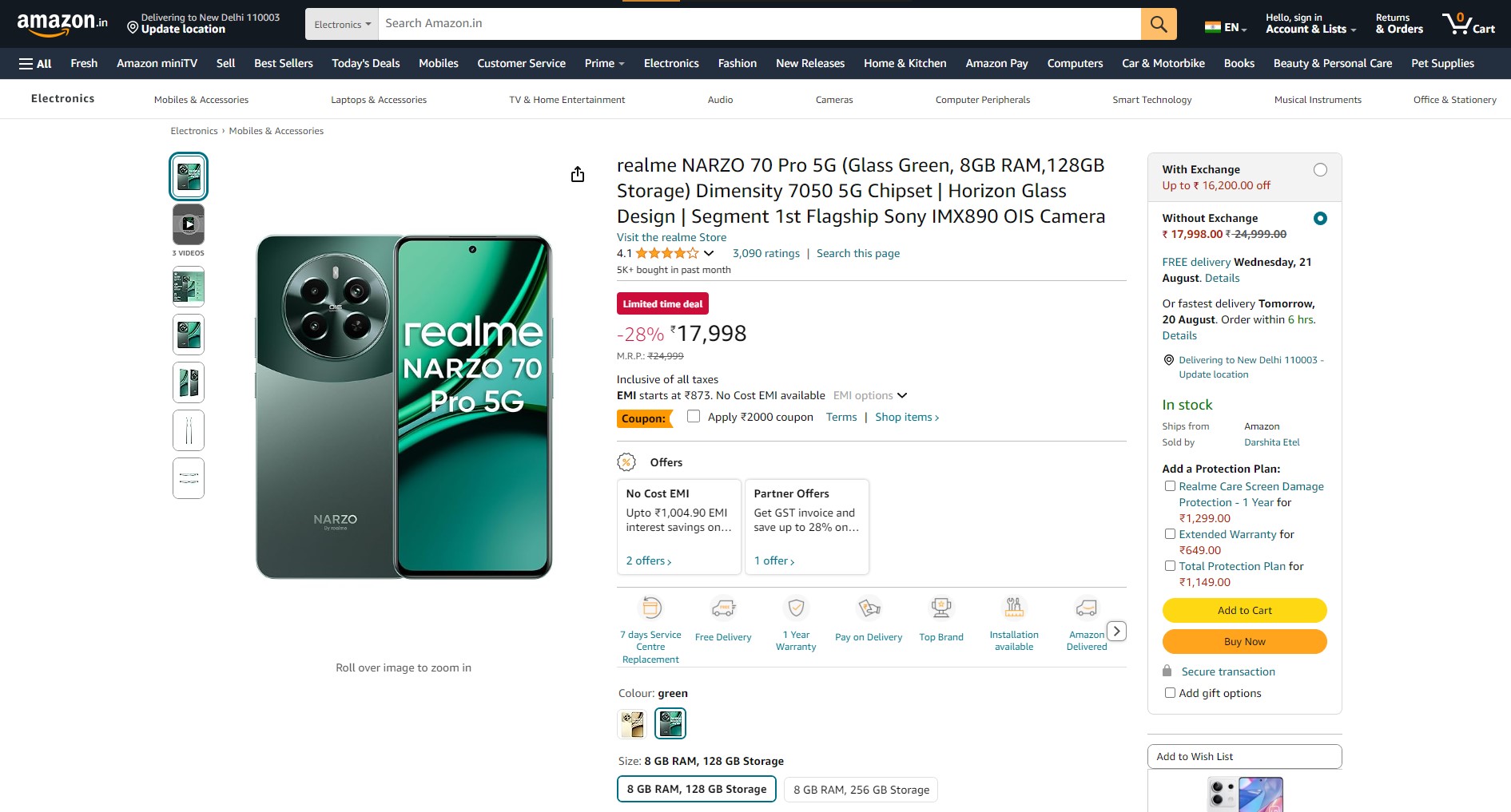Realme Narzo 70 Pro is available at a starting price of Rs 17,998 (8GB + 128GB) on Amazon. The 8GB + 256GB trim costs Rs 18,998. It is available in Glass Gold and Glass Green shades. On the 128GB trim, you can get Rs 2,000 off via coupon cashback. On the 256GB trim, you can avail Rs 2,500 discount via coupon.