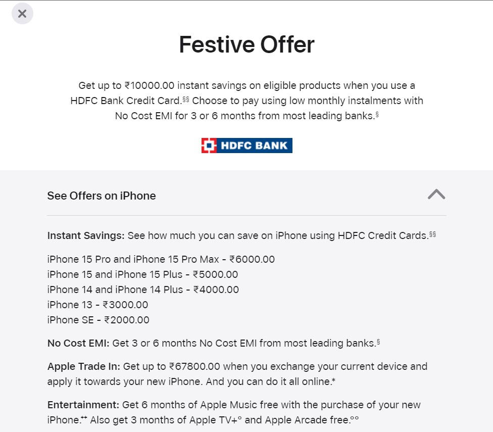 The company is promising up to Rs 6,000 discount on iPhone 15 Pro and iPhone 15 Pro Max. You can avail up to Rs 5,000 discount on iPhone 15 and iPhone 15 Plus. For context, the iPhone 15 starts from Rs 79,900, the iPhone 15 Plus from Rs 89,900, the iPhone 15 Pro from Rs 1,34,900 and the iPhone 15 Pro Max from Rs 1,59,900.