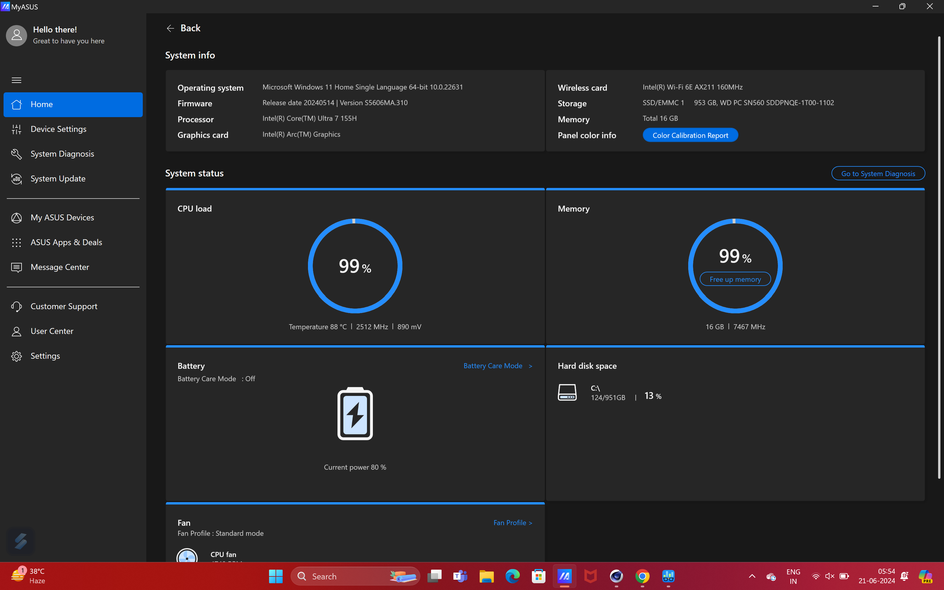 While the CPU temperature clocked over 93 degrees for a while, a slight dip in performance was noticeable after 99 per cent CPU and RAM usage (screenshot above). You can also edit videos and graphics while on the go with performance mode activated. But keeping it on a flat surface as the dual fans jet out hot air at 'full-speed mode' to keep the internals cool is the best choice. Also, you cannot expect a dedicated GPU-level performance from Intel Arc.