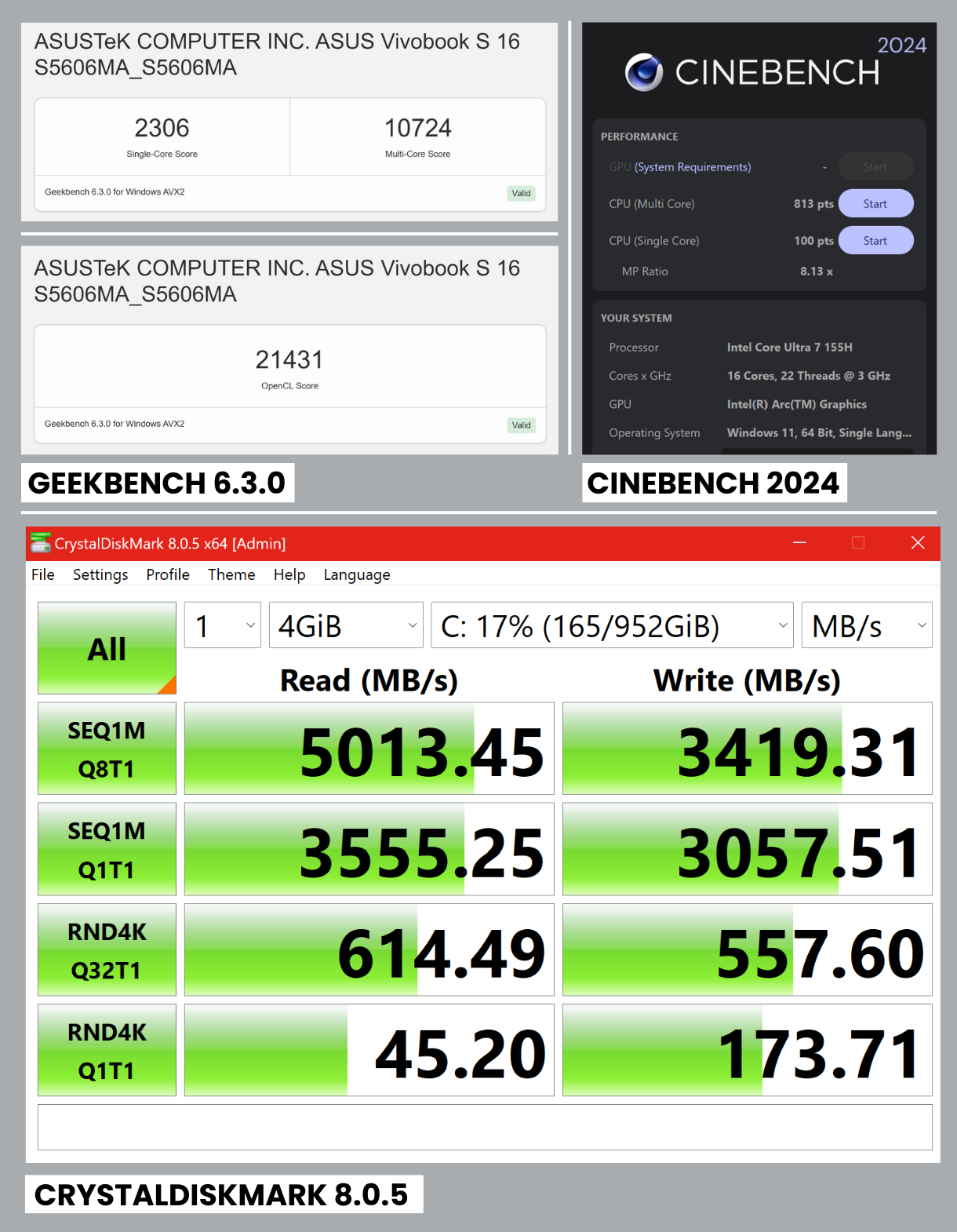 ASUS Vivobook S16 2024 Ultra 7 benchmark scores. (Image:JE)
