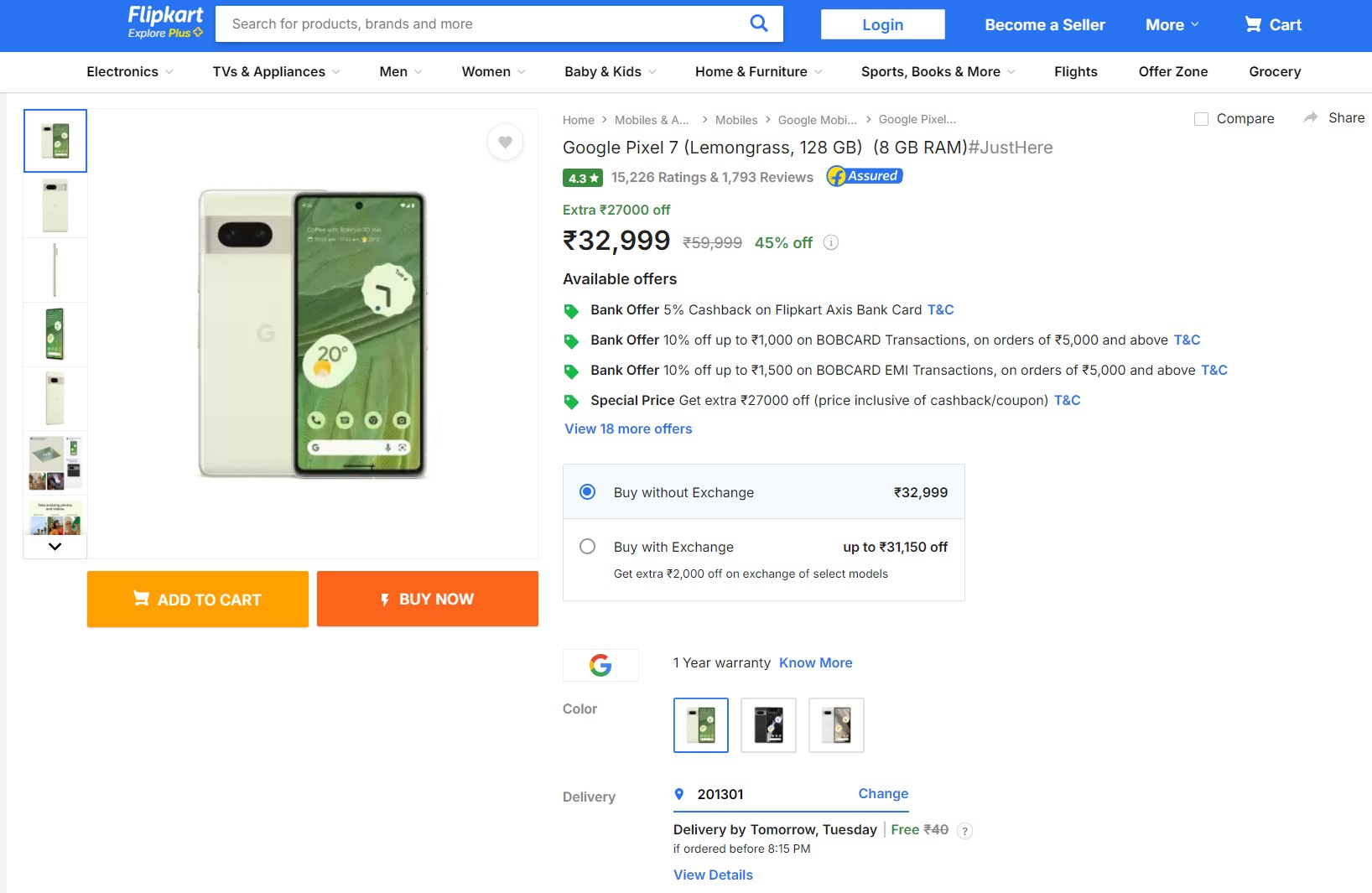 Google Pixel 7 is available for Rs 32,999 on Flipkart. It is listed in Snow, Obsidian and Lemongrass colours. The bank offers on the phone remain the same as the Pixel 7 Pro. Additionally, buyers can get Rs 3,000 off via combo offer and up to Rs 31,150 off via exchange cashback (inclusive of Rs 2,000 off via exchange of select models).