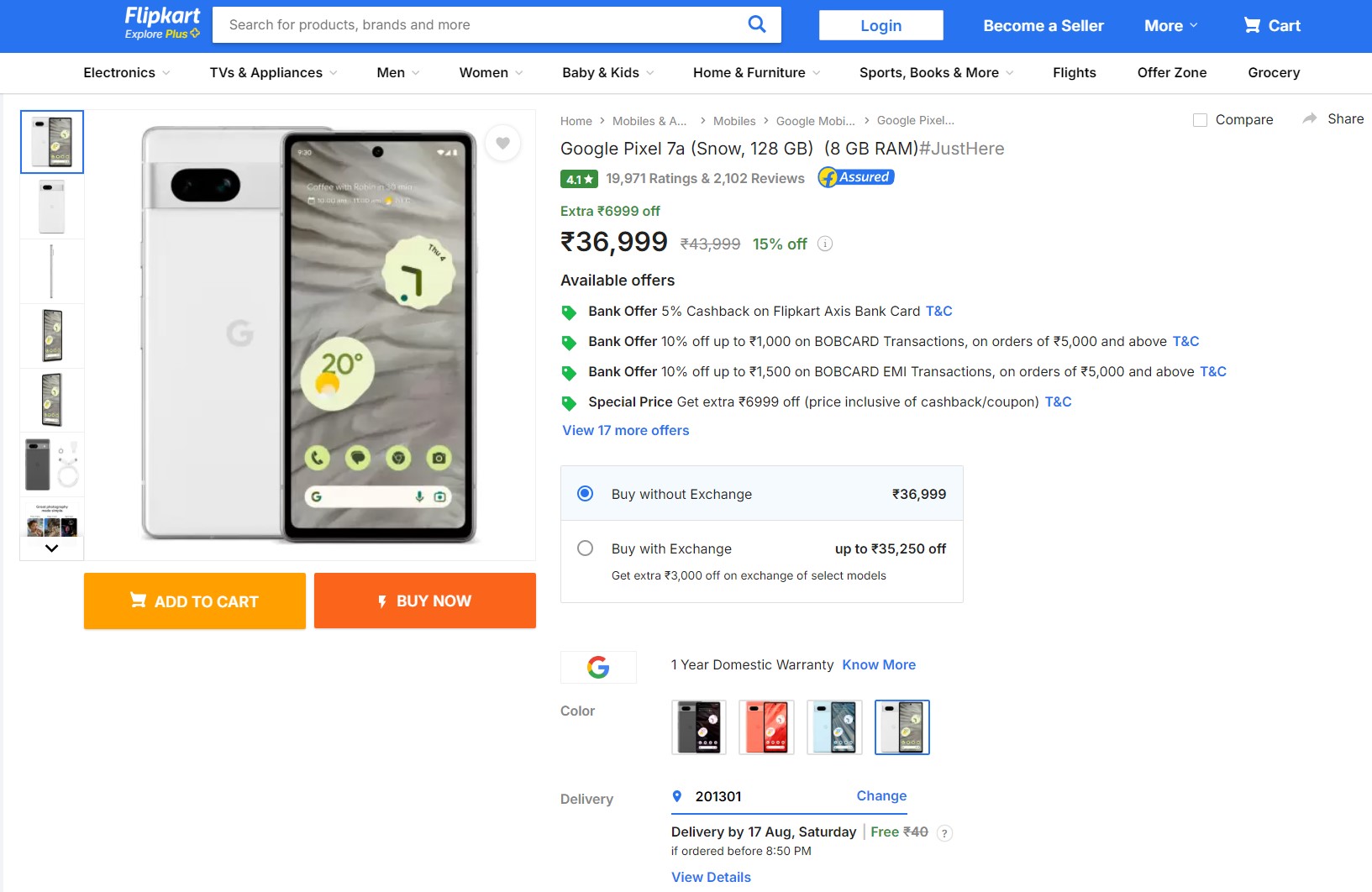 Google Pixel 7a's Coral shade is available for Rs 35,999 (8GB + 128GB). The other colours (Charcoal, Sea and Snow) shades cost Rs 36,999 on Flipkart. The bank offers remains the same on the smartphone like the Pixel 7 Pro. Apart from this, buyers can grab up to Rs 35,250 off via exchange (an extra Rs 3,000 off via exchange of select models included).