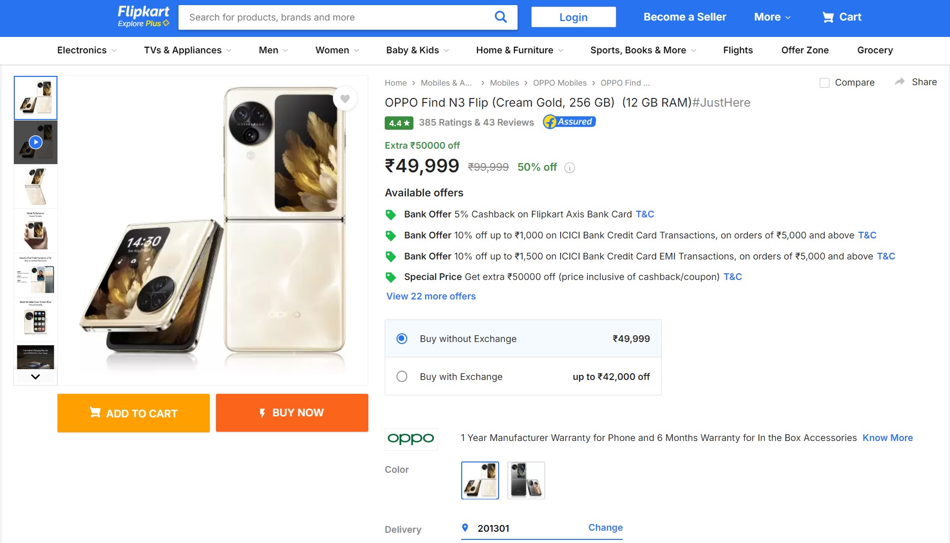 The flagship foldable is currently available for Rs 49,999 (12GB + 256GB) on Flipkart. It comes in Cream Gold and Sleek Black colours. You can grab up to Rs 1,800 off via ICICI Bank debit card EMI transactions or five per cent cashback via Flipkart Axis Bank Card. While you can check out offers on other bank cards, the maximum discount may vary.