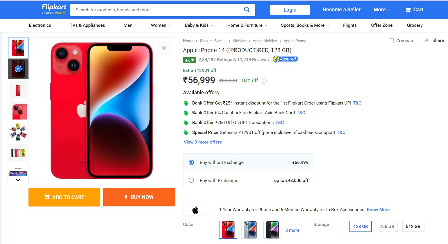 The base (128GB) model of the phone costs Rs 56,999 on Flipkart. iPhone 14's 256GB and 512GB are available for Rs 69,999 and Rs 86,999. As for bank offers, you can avail a five per cent cashback via Flipkart Axis Bank Card and Rs 750 off via UPI transactions, subject to Flipkart terms. Speaking of other offers, customers can avail up to Rs 50,000 off via exchange.