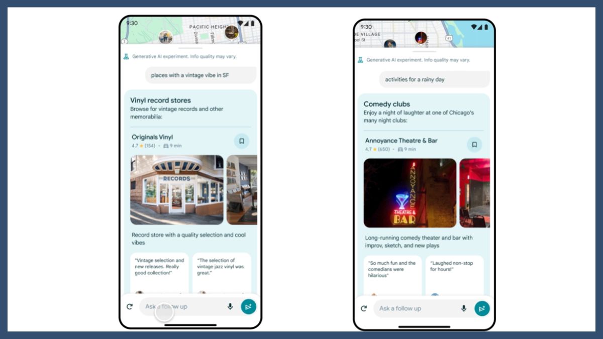 "Let's say you're visiting San Francisco and want to plan a few hours of thrifting for unique vintage finds. Just ask Maps what you're looking for, like 'places with a vintage vibe in SF.'" After the input is entered, Maps will analyse rich information from businesses and places with images, ratings and reviews added by the Google Maps community to return "trustworthy suggestions."