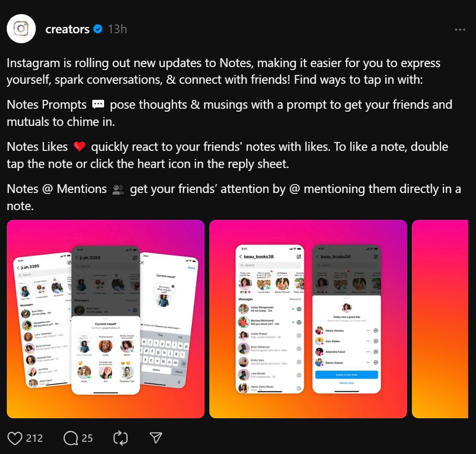 According to Instagram, these new enhancements will help with expression, initiating conversations and connecting with friends on the platforms. For example, Notes Prompts can let users spark new conversations and "pose thoughts and musings with a prompt to get your friends and mutuals to chime in", Instagram said. These may appear in a separate window.