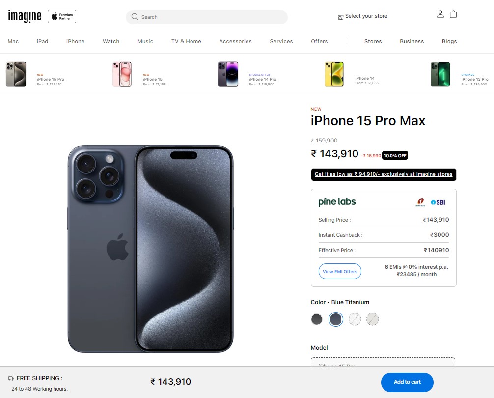 As a second option, the 15 Pro Max is available at a starting price of Rs 1,43,910 (256GB) on Imagine Online. You can get a Rs 3,000 instant discount via EMI offers on select SBI and ICICI bank transactions. The Blue and Black colours of the device are available on the websites at the time of writing. To sum up, the iPhone 15 Pro Max's deal on Flipkart is a better deal. However, for the ones who cannot get their hands on the offers, Imagine is the next best choice.