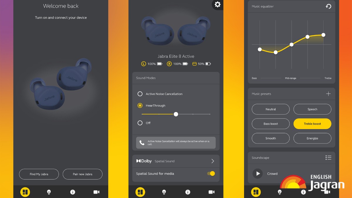 Jabra's 'Sound+' offers a range of features such as battery status, custom equaliser presets (with manual toggles), and Find My Jabra to track the last paired location. The tuning of the in-app equaliser is commendable. Even with one frequency boosted, you do not miss the other one completely. As for some peace, Active Noise Cancellation works fine on the buds and cancels a range of background frequencies.