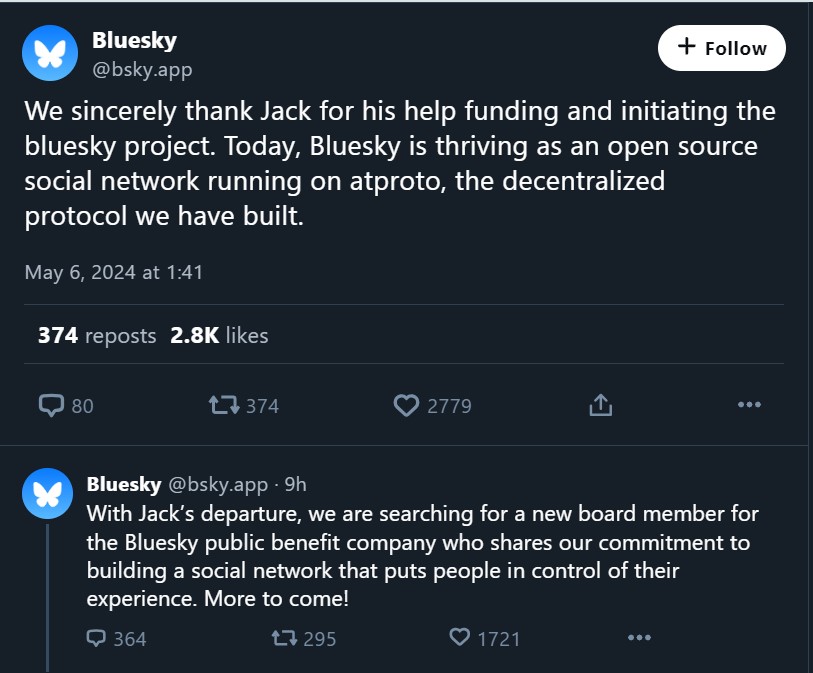 Bluesky's statement on Jack Dorsey's departure.