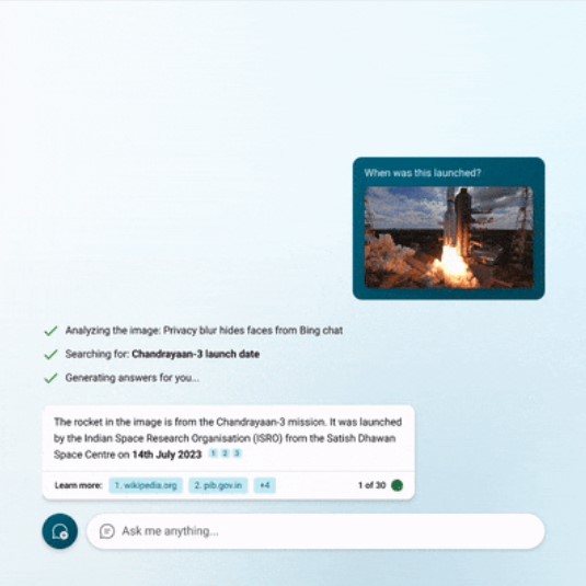 Multi-Modal Search Grounding: The company is combining powers of GPT-4's vision capabilities with Bing Image Search and web data to understand queries. It will be available soon. In this demo, the image of Chandrayaan-3 with the prompt "When was this launched?" was presented. The Copilot returned the essential information with the date.