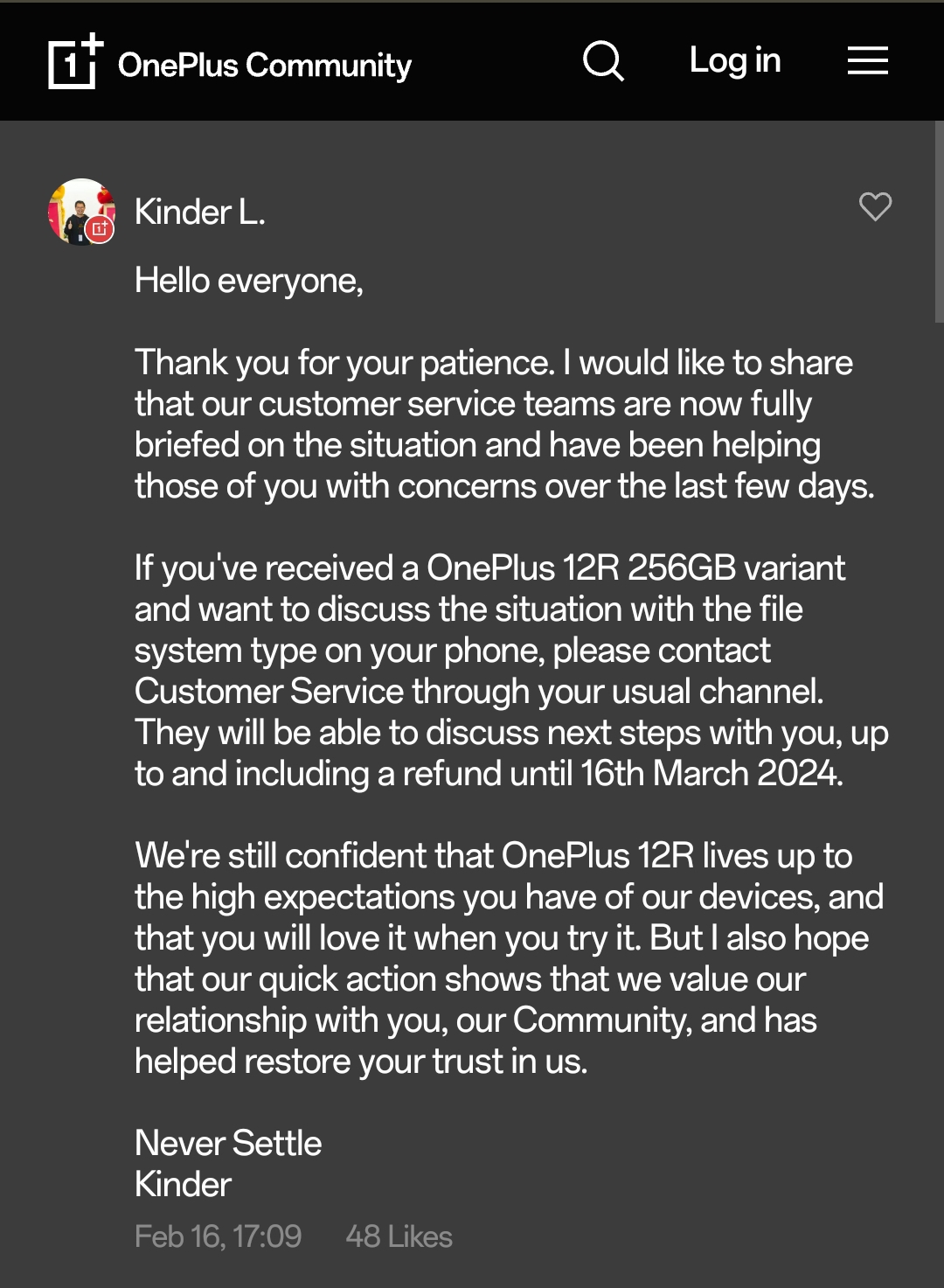 "If you've received a OnePlus 12R 256GB variant and want to discuss the situation with the file system type on your phone, please contact Customer Service through your usual channel. They will be able to discuss next steps with you, up to and including a refund until 16th March 2024," Liu posted in a OnePlus Community note.