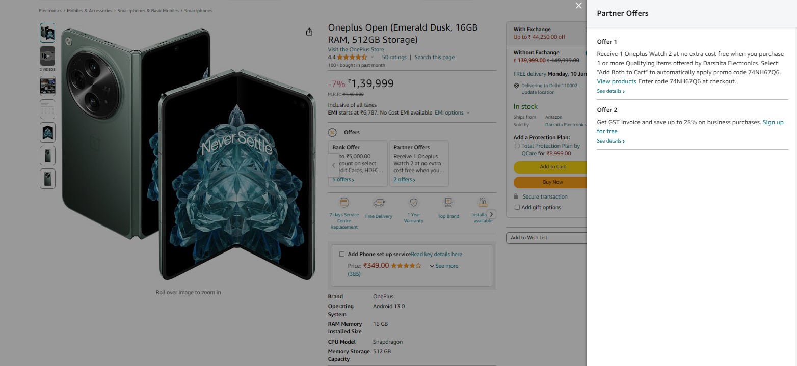 The offer is available on OnePlus' official website and Amazon. If you plan to buy the foldable in India, here are the offers and more details.