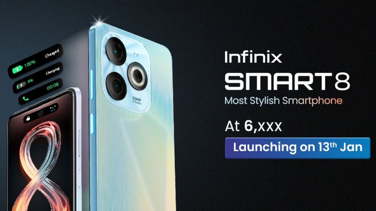 Dubbed "the most stylish phone", the Infinix Smart 8 will launch in India at an introductory price of under Rs 7,000. It will debut on January 13 and will be available on Flipkart. The phone will ship with a 50MP primary lens on the back.