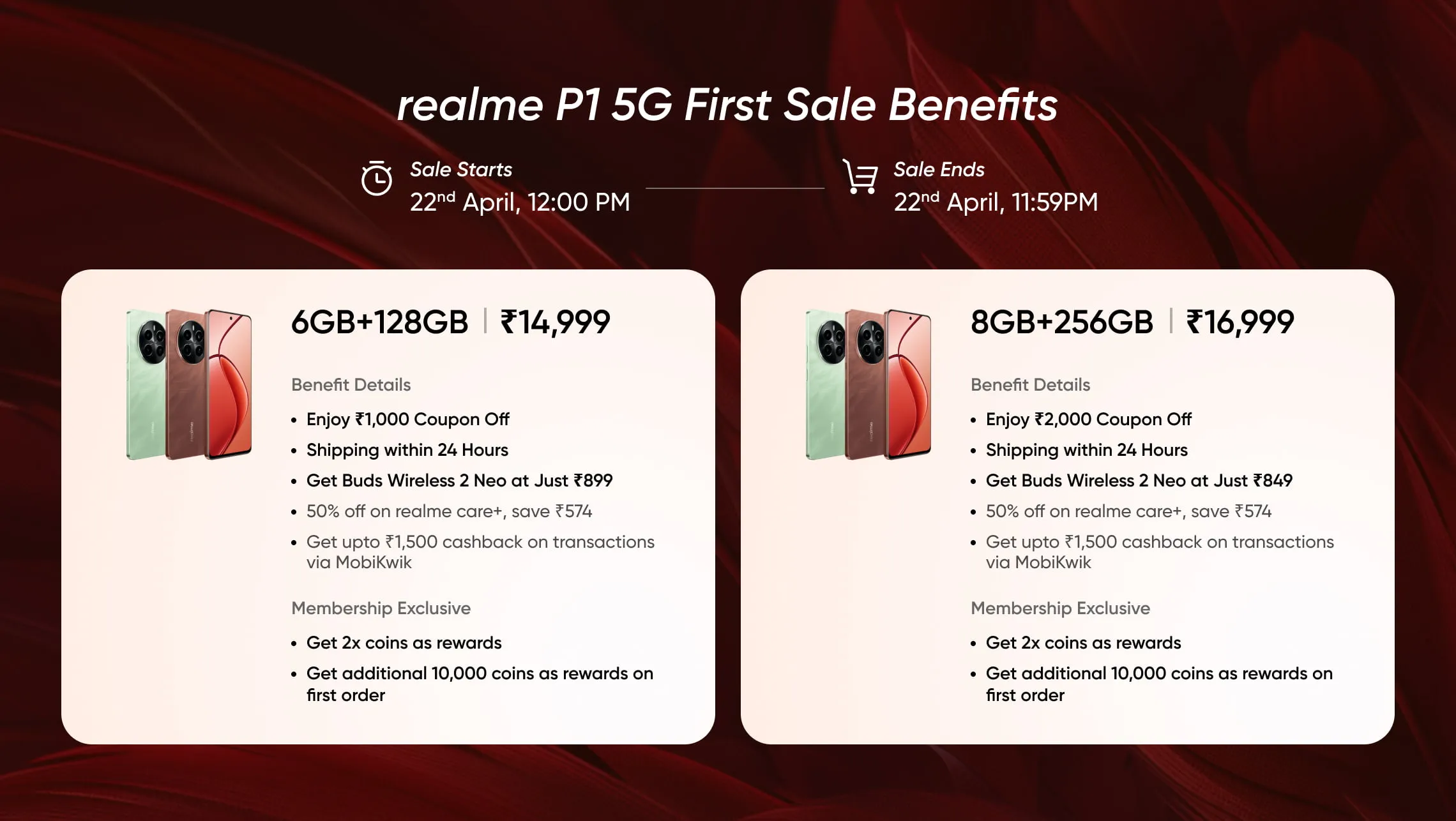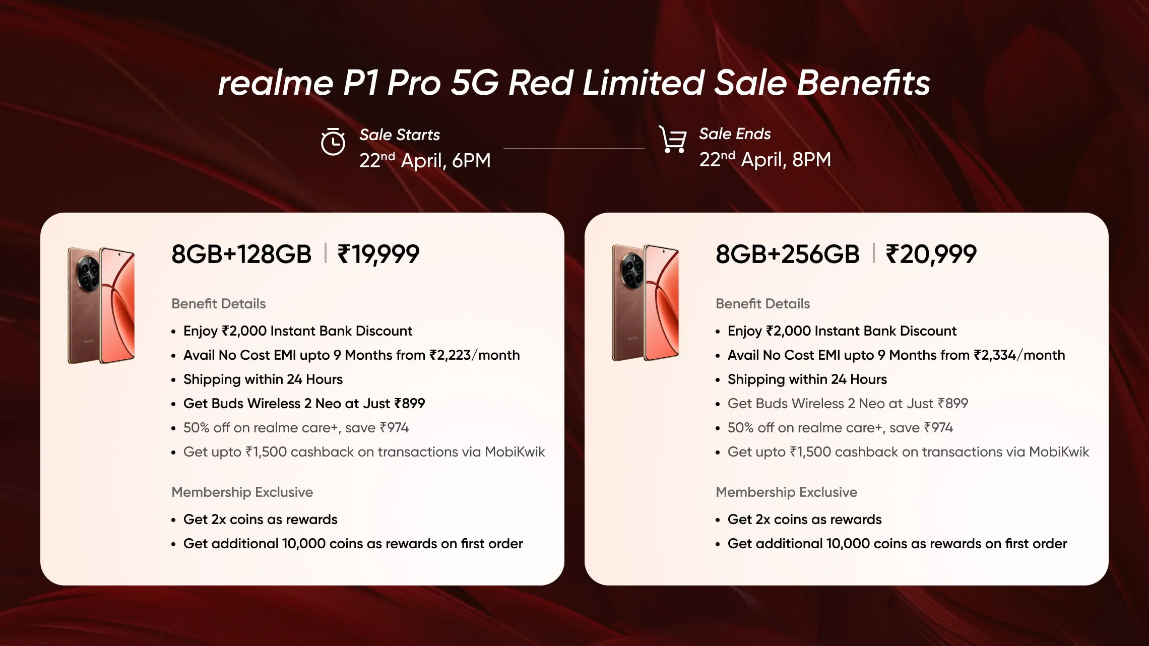 Realme P1 Pro will be available at a starting price of Rs 21,999 (8GB + 128GB), and the 8GB + 256GB will cost Rs 22,999. Buyers can avail Rs 2,000 discount via bank offer (select ICICI, HDFC, and SBI bank cards) on both trims. Realme.com also advertises up to Rs 1,500 cashback via MobiKwik transactions and Buds Wireless 2 Neo for Rs 899.