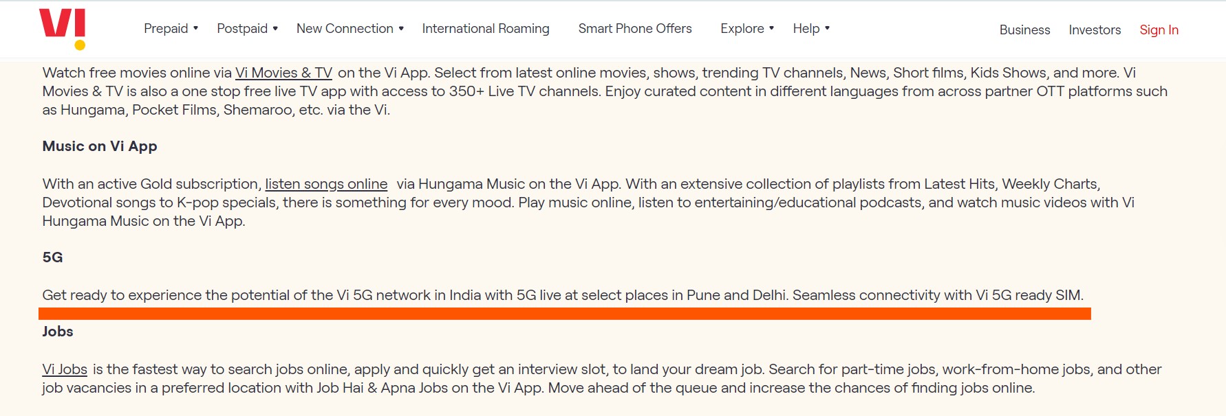 Coming back to the present, on the official website of Vi, the company has stated the below-mentioned text within the 5G subhead: "Get ready to experience the potential of the Vi 5G network in India with 5G live at select places in Pune and Delhi. Seamless connectivity with Vi 5G ready SIM."