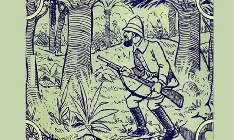 A black and green illustration can be seen in the picture. The hunter as we can see is surrounded by trees in the jungle. But can you see the elephant? The picture doesn't consist include any single object that resembles an elephant.