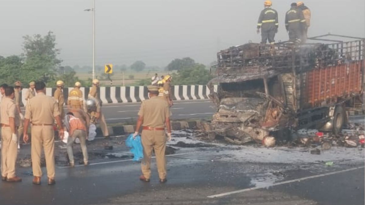Aligarh Accident: A tragic accident occurred on Tuesday morning at the Gopi Overbridge on the Aligarh-Kanpur Highway. A car crossed the divider and collided with an oncoming canter, causing both vehicles to catch fire.