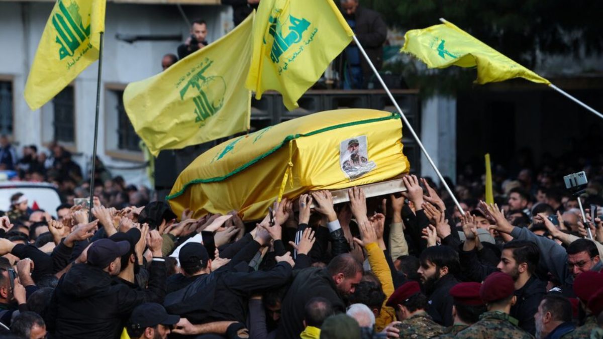 Mourners carry a coffin during the funeral of Wissam Tawil, a commander of Hezbollah’s elite Radwan forces who according to Lebanese security sources was killed during an Israeli strike on south Lebanon. (Image: Reuters)