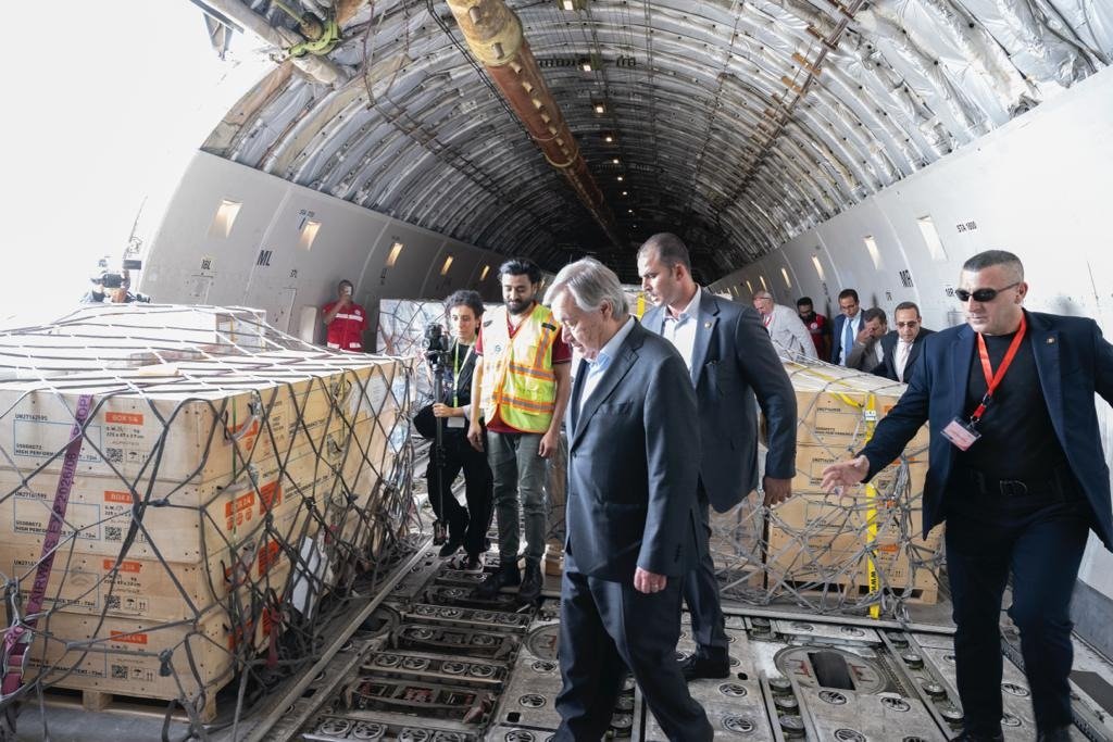 At the Rafah crossing, @antonioguterres appeals once again for aid trucks to be allowed into Gaza as soon as possible. https://t.co/L4fXVI2eBF pic.twitter.com/2j8epS29ku